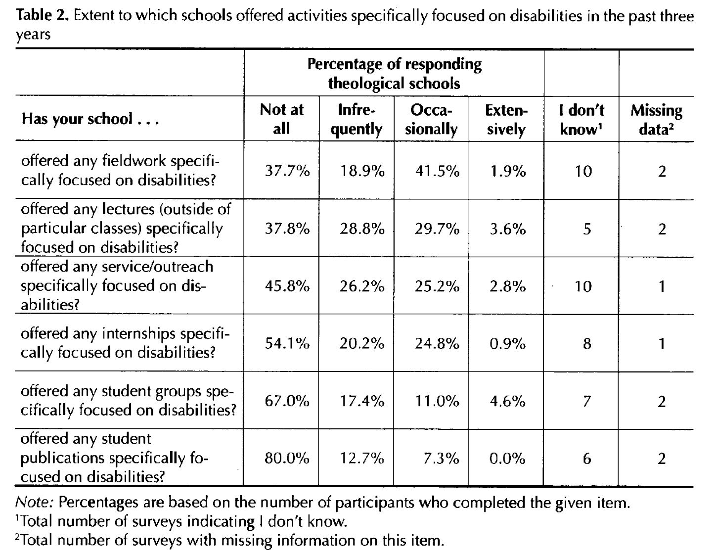 Fieldwork and internships related to disabilities were reported as being £airly limited during the prior three years, specifically, less than one quarter o£ schools offered internships £ocused on disabilities at least occasionally, while £ewer than two fifths offered fieldwork focused on disabilities at least occasionally. Lectures, service and outreach opportimities, and publications related to disabilities were £airly infrequent. Such personal encounters represent powerful opportunities £٠٢ deepening understanding o£ disabilities and ministry because they hold potential to £acilitate relationships between seminary students and persons with disabilities.