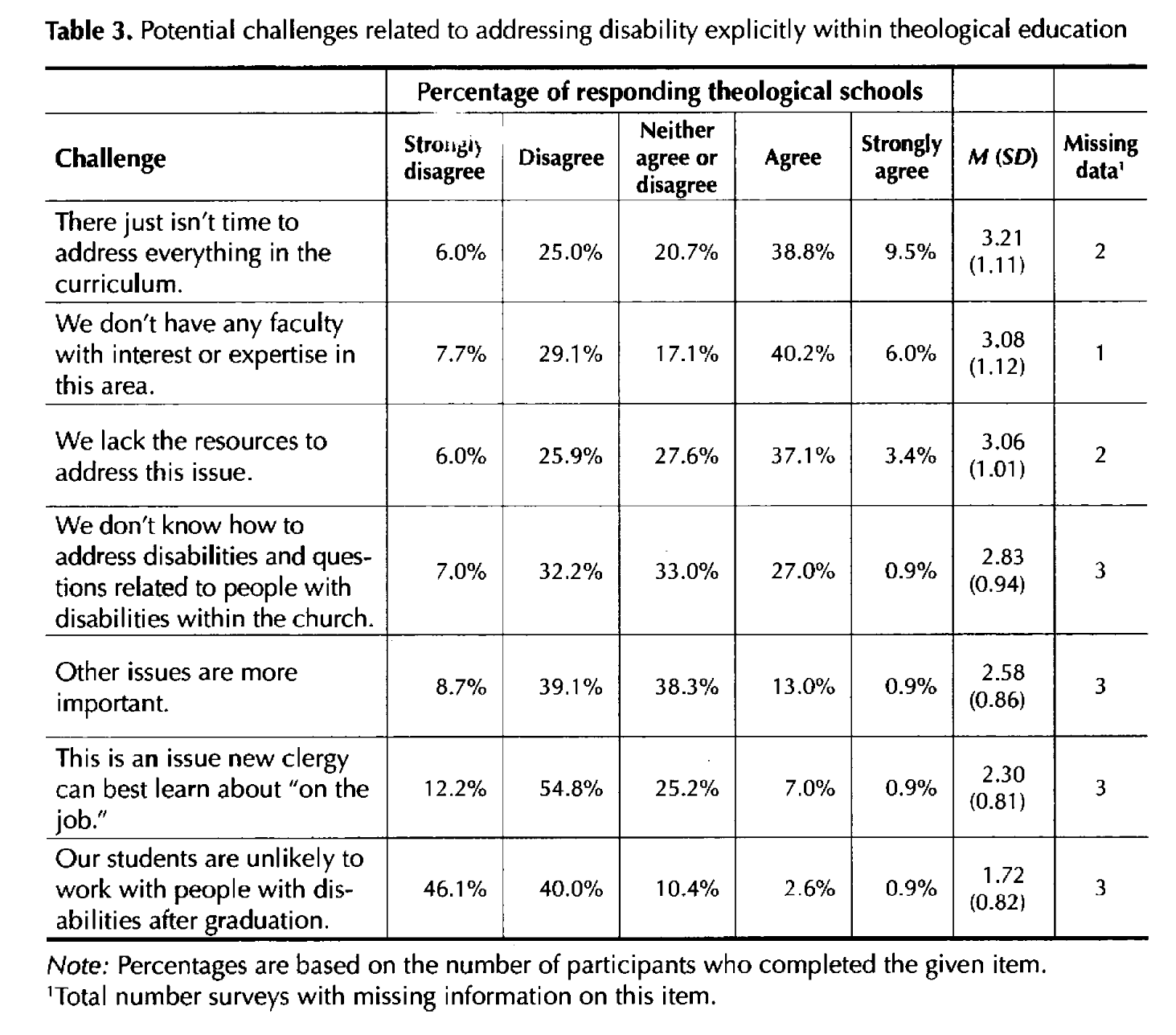 Although occasionally addressed in courses addressing pastoral care, religious education, and spiritual formation, disability was less frequently addressed in the disciplines of theology, biblical studies, and historical studies. This represents an important omission in terms of student preparation for ministry.