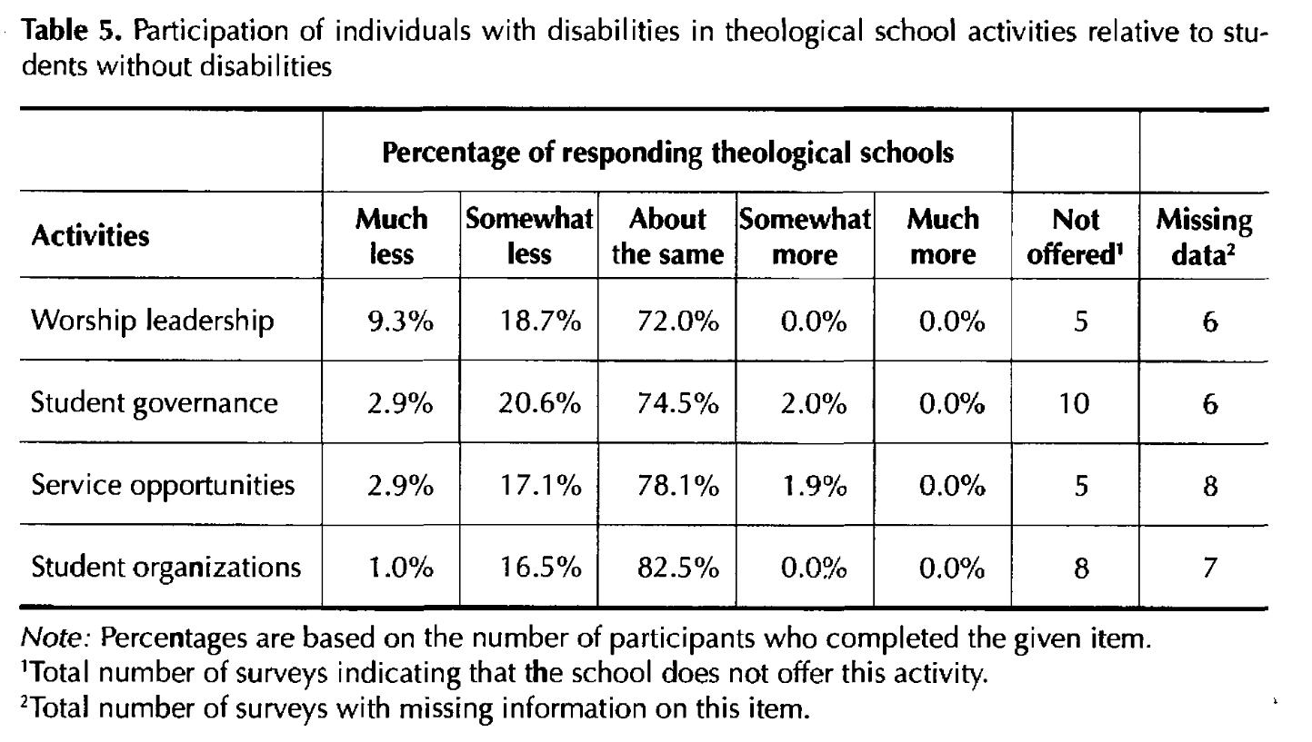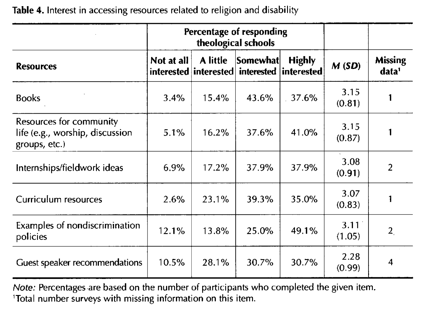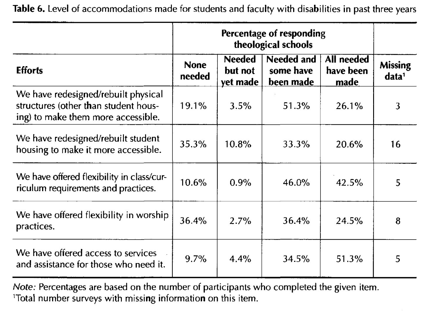 A paper from Vanderbilt University that explores how schools with a theology department, particularly ones that are preparing clergy to lead the church, have lacked in educating regarding disabilities and what can be done about it going forward. The study surveyed college leaders (i.e. deans) and only 10.6% identified as having a disability. The results conclude that there is very little focus on disabilities in the schools surveyed and most people being prepare for ministry will be inadequately prepared to minister to those with disabilities.