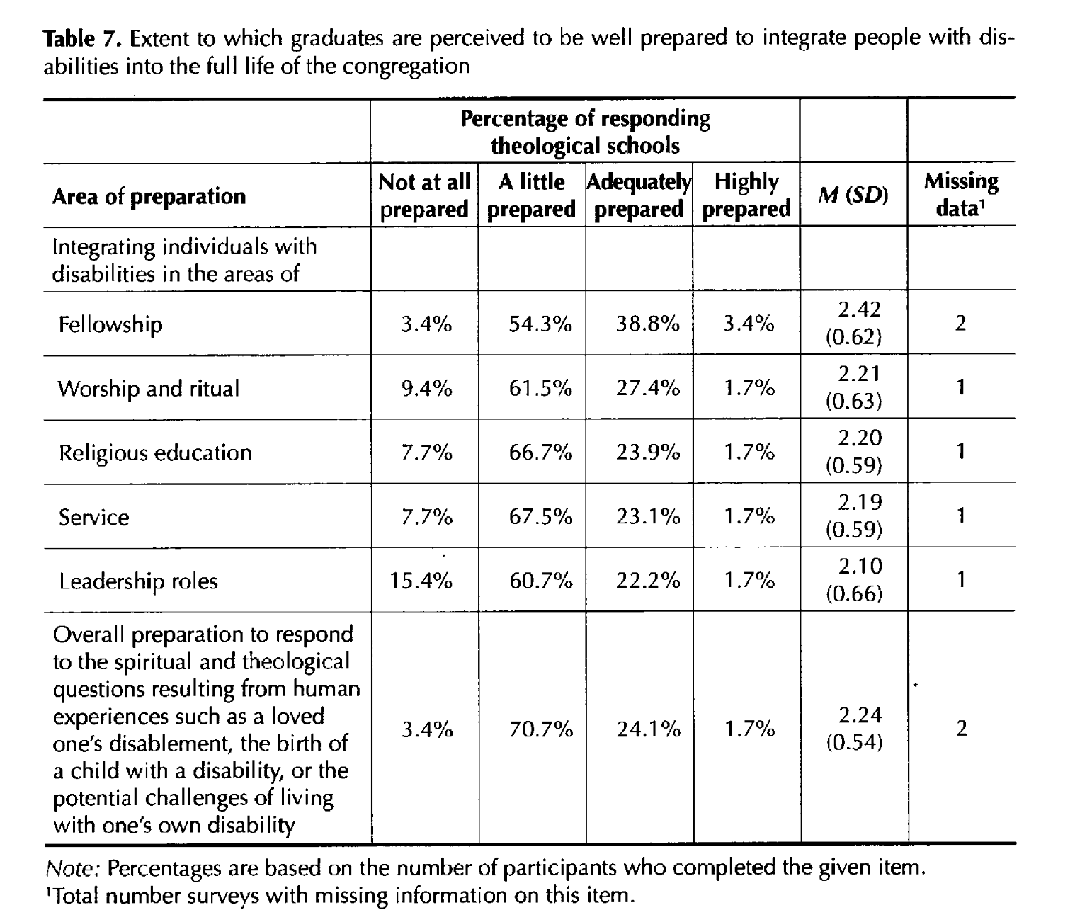 we found that most academic leaders felt that their graduates received little or no preparation that would help them to include people with disabilities into multiple dimensions of congregational life (i.e., fellowship, worship and ritual, religious education, service, and leadership) or to respond to spiritual questions resulting from disability experiences. Although people with disabilities are participating more fully in their wider communities,^ many clergy in North America are not leaving seminary well prepared to address the needs o£ a growing proportion o£ their congregation members.
