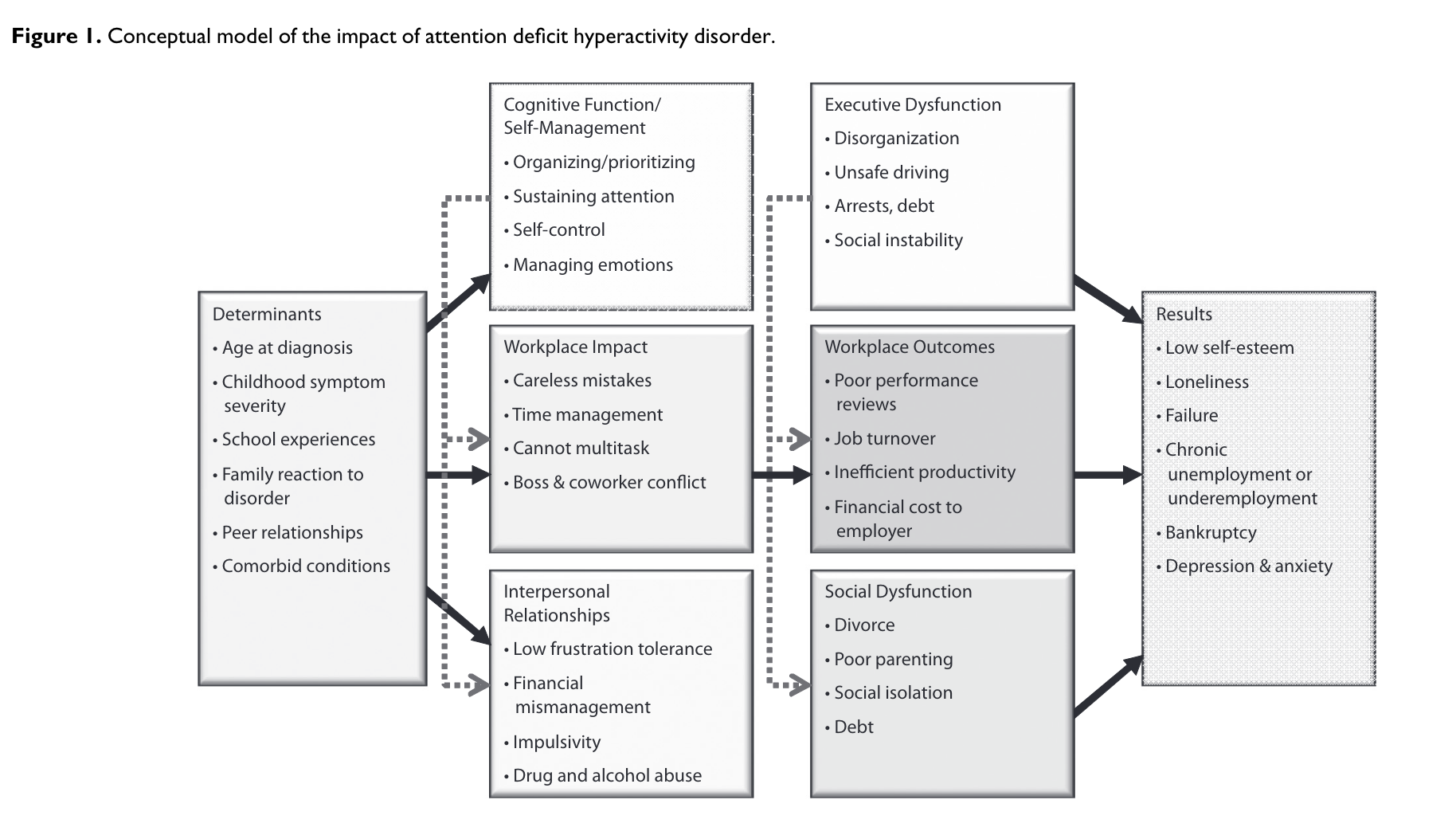 While ADHD was once considered a behavior disorder, it is widely recognized that many individuals with ADHD do not Cognitive Function/ Self-Management • Organizing/prioritizing • Sustaining attention • Self-control • Managing emotions Workplace Impact • Careless mistakes • Time management • Cannot multitask • Boss & coworker conflict Interpersonal Relationships • Low frustration tolerance • Financial mismanagement • Impulsivity • Drug and alcohol abuse Results • Low self-esteem • Loneliness • Failure • Chronic unemployment or underemployment • Bankruptcy • Depression & anxiety Determinants • Age at diagnosis • Childhood symptom severity • School experiences • Family reaction to disorder • Peer relationships • Comorbid conditions Executive Dysfunction • Disorganization • Unsafe driving • Arrests, debt • Social instability Workplace Outcomes • Poor performance reviews • Job turnover • Inefficient productivity • Financial cost to employer Social Dysfunction • Divorce • Poor parenting • Social isolation • Debt Figure 1. Conceptual model of the impact of attention deficit hyperactivity disorder