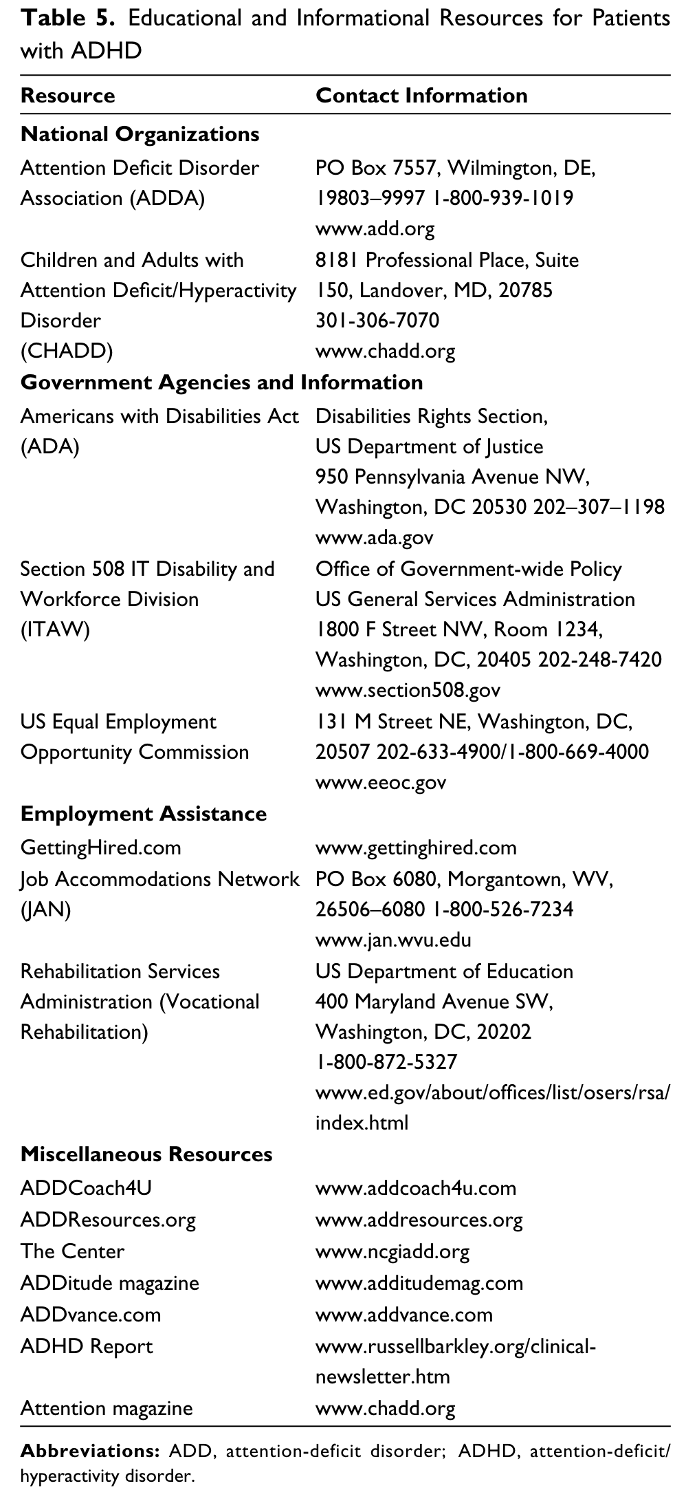 Although trained mental health professionals and career counselors are available to help adults cope with the symptoms and comorbidities of ADHD and guide them toward careers in which they can be successful, patients may not be able to find a counselor with these skills.4 Primary care providers, who serve as a home base for patient-centered medical issues, are concerned with the overall well-being of the patient and the patient’s family. Thus, they are well suited to help adults with ADHD obtain the care and support they need through early and successful intervention and referrals to community resources to help them build the appropriate skills and manage occupational and other issues