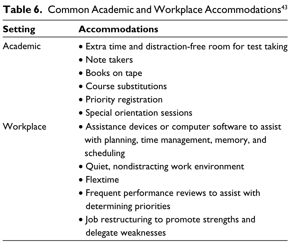 However, ADHD is a condition in which multiple domains of life are impacted, and such criteria do not necessarily account for the impact of daily work and personal demands that may have brought the patient to the office. Management of adult ADHD, therefore, may require a multimodal approach that combines pharmacologic, cognitive, and behavioral therapies,43–45 and it should be treated as a lifelong disability, similar to other manageable conditions such as diabetes.43